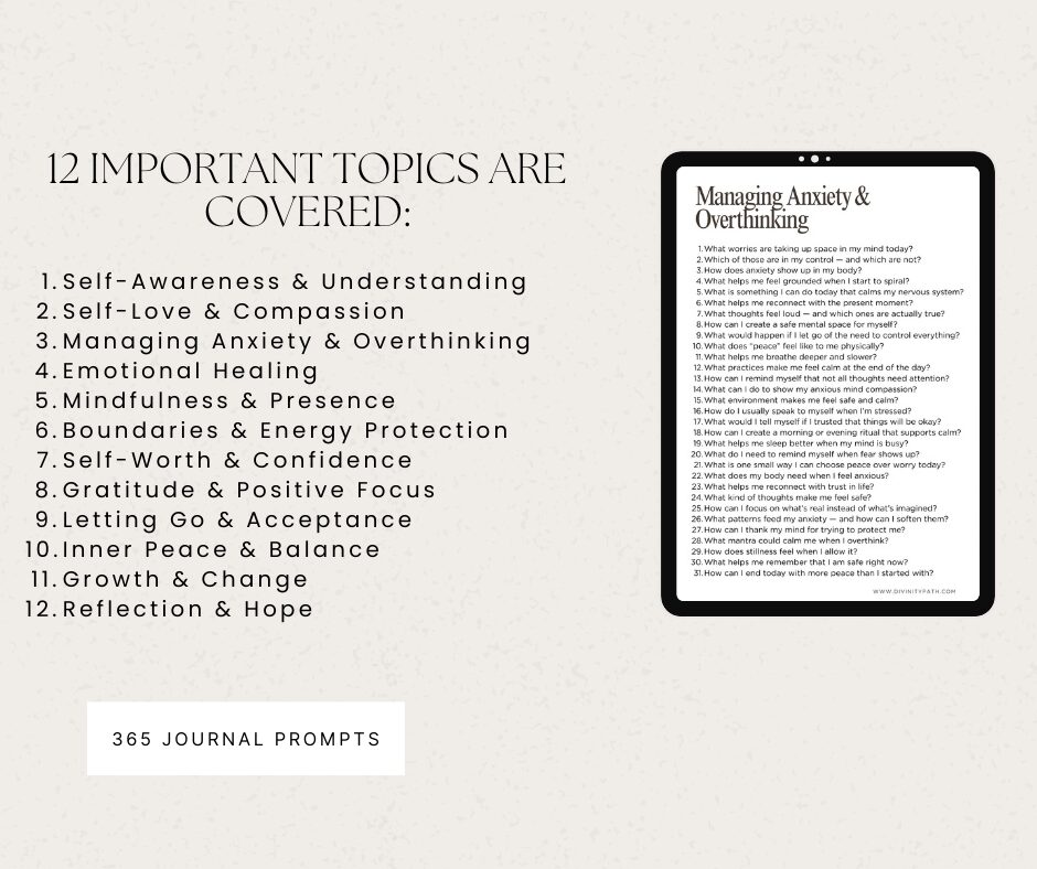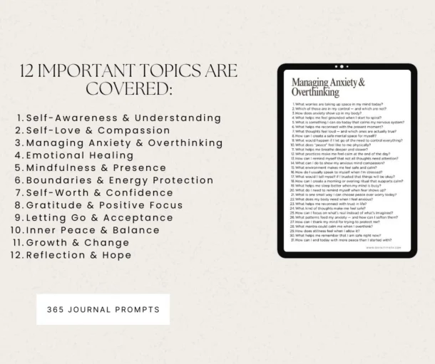 365 Mental Health Journal Prompts is designed for all of us who want to track our mental health, thoughts, and emotions throughout the year, without constantly searching for new prompts. By regularly answering these questions, you start to notice patterns—where you keep getting stuck, what holds you back, which thoughts keep repeating, and where you’re actually making progress. Over time, it becomes clear what in your life needs change, more attention, or a different approach. The great thing about these prompts is that you don’t just use them once—you can return to them throughout the year.